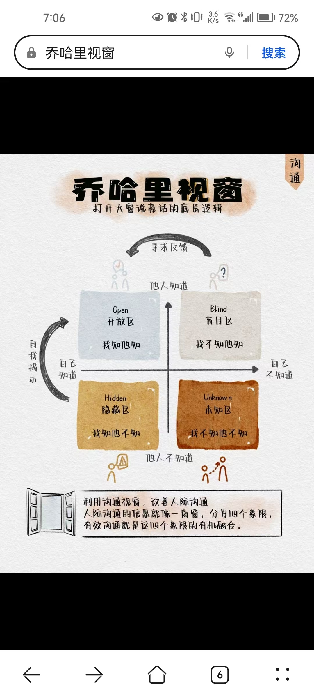 自我成长的关键, 就是扩大“公开区”, 减少“盲点区”,主动听反馈; 缩小“”隐藏区”:学会表达自己; 探索“”未知区”:勇于尝试,发现可能。 人生90%的沟通问题,都源于这四个象限的失衡。