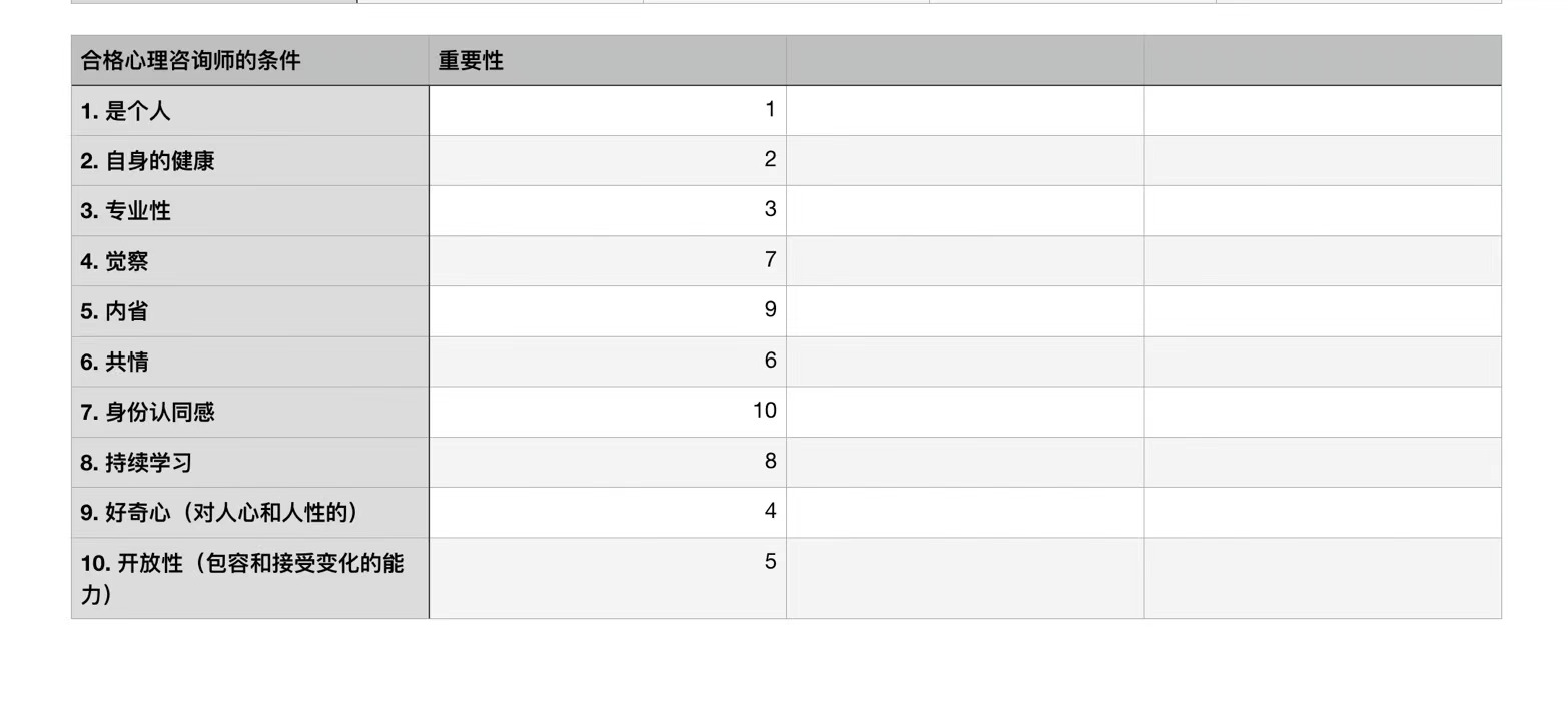 离226年第9场读书会快要结束前20分钟,同伴提出来做个互动分享,他又用采访的形式向我问了一个问题:你认为一名合格的心理咨询师需要具备哪些条件,10个?