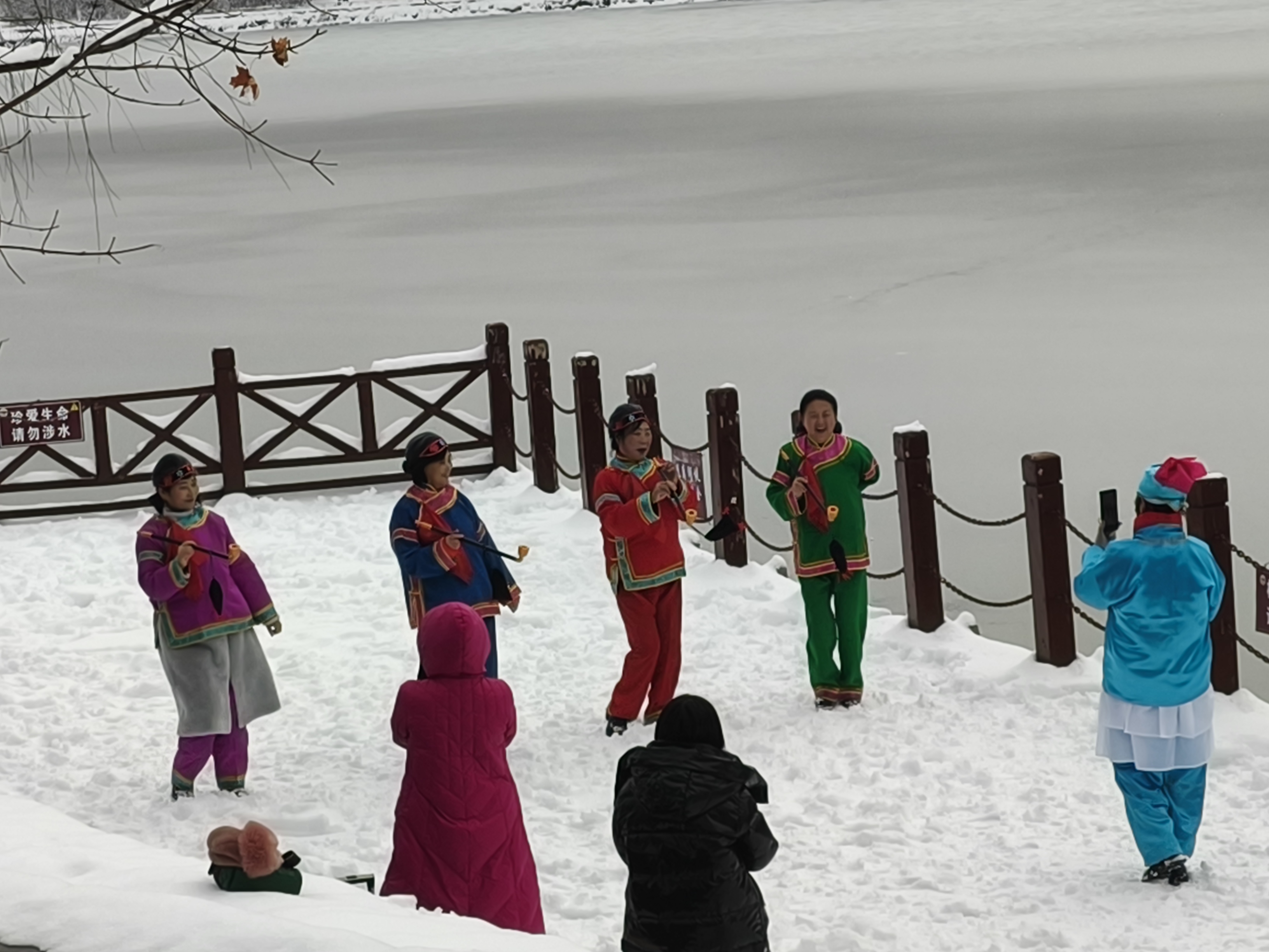 成人的世界,在雪地上绽放的更精彩,五个一堆,六个一群,那种各种围巾或媒婆的演出服,举着长长的烟袋锅子,在美如画的湖边雪景中,十分投入的表演,在抖音视频里,频繁上传。女人的前半生忙于生计,结婚工作带孩子,陪孩子,一路走来,发现年过五十,忽然顿开茅塞,要活出自己,闺蜜一吆喝,群聚逗乐拍抖音,跳广场舞,打太极……要多丰富多彩就有多丰富多彩,这场雪不仅带来了惊喜,更带来了静美,过滤了空气的杂质,更过滤了心灵,我在这静美中享受着……