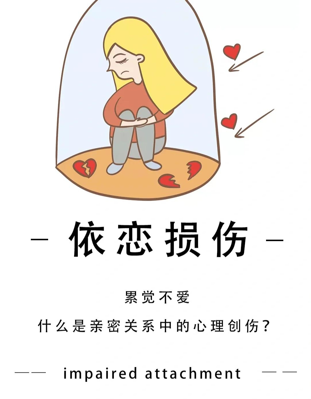 依恋障碍指的是幸存者在童年阶段找不到一个可以与之发展健康的亲密关系的安全可靠的成年人。因此也就无法向他人学到建立亲密关系的关键技巧。当与照料者建立健康关系的发展需求没有得到满足时,幸存者在成年后通常就很难找到并维系健康关系的支持性关系。