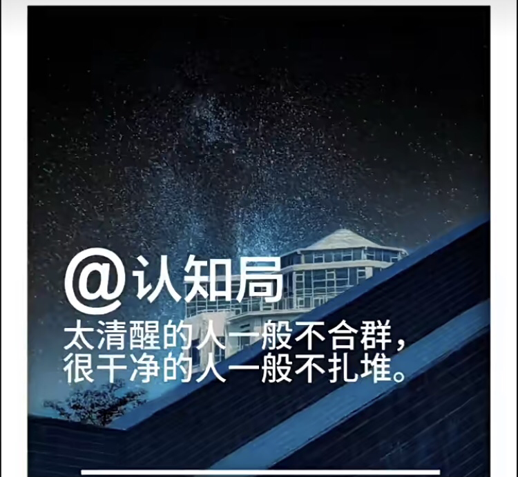 太清醒的人一般不合群, 很干净的人一般不扎堆。 选择独来独往的人是非常值得深交的, 问题是这类人一般不交朋友。