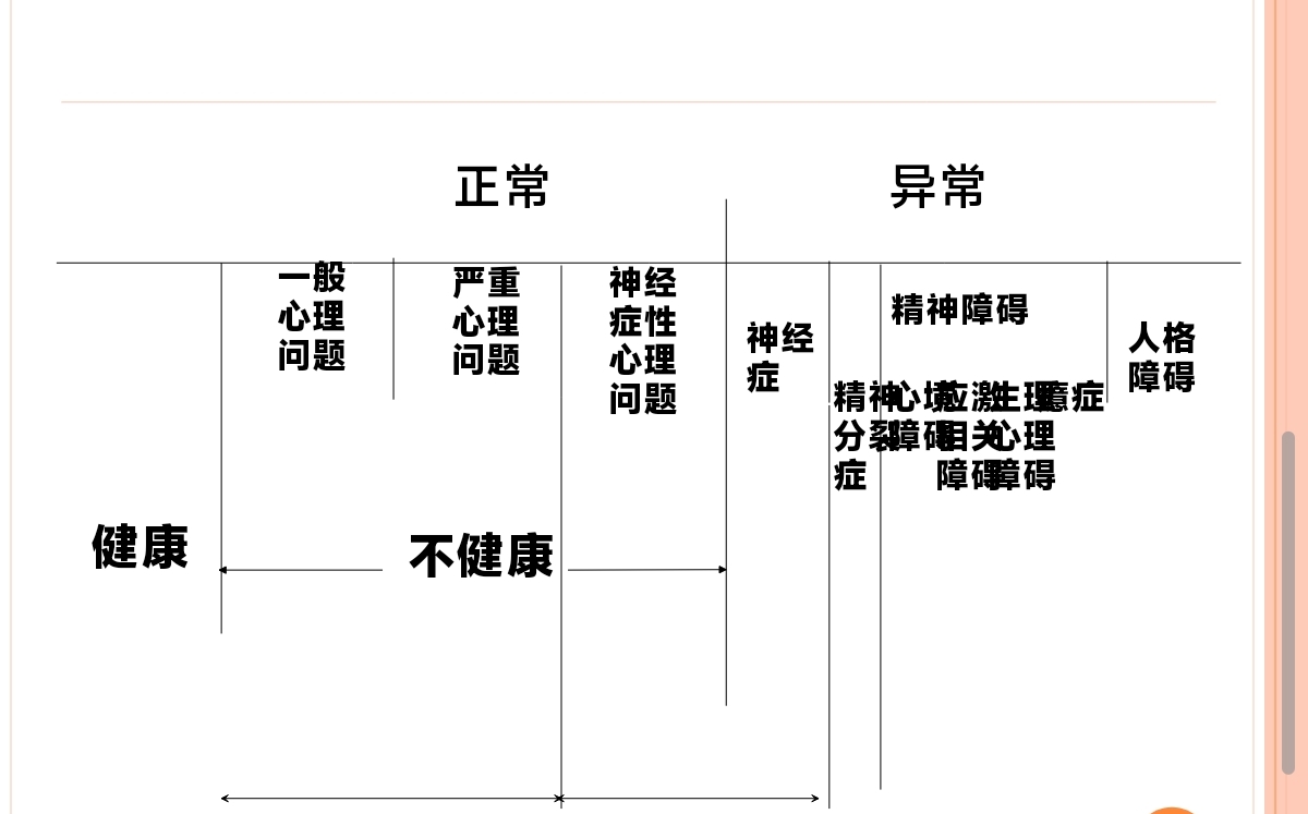 如何判定心理异常? (一)三原则: 1、主观世界与客观世界的统一性原则 2、心理活动的内在协调性原则 3、人格相对稳定性原则 (二)求助者具有典型意义的某些特异行为表现进行定性(三)从求助者的“求医行为”来判断其为神经症或重性精神病 (四)从求助者对“症状”的“自知”程度来分析 (五)不属于心理咨询范围问题的处理