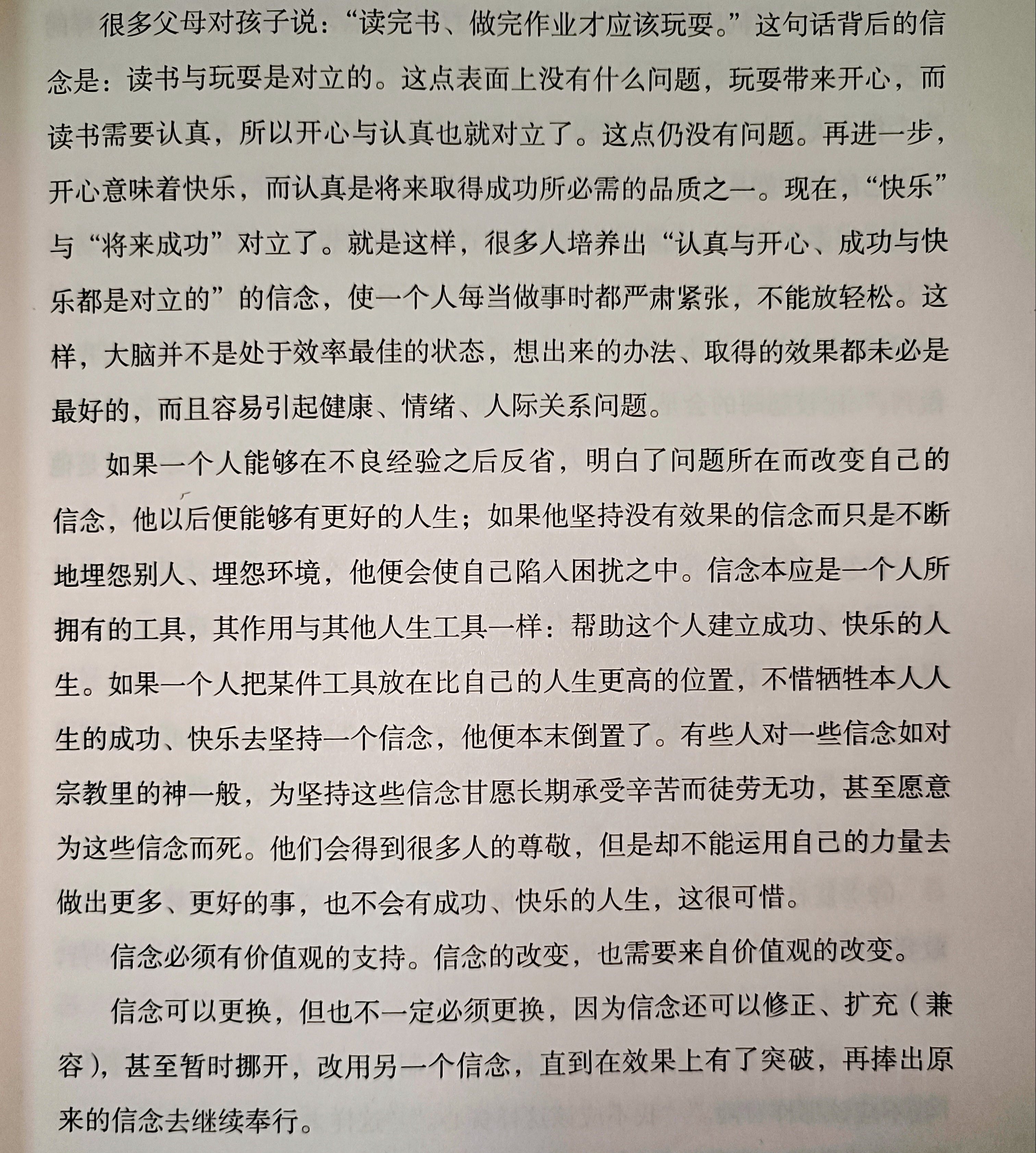 信念是我们所拥有的工具,其作用与其他人生工具一样:帮助我们建立成功快乐的人生。如果一个人把某件工具放在比自己的人生更好的位置,不惜牺牲本人人生的成功快乐去坚持一个信念,便本末倒置了。