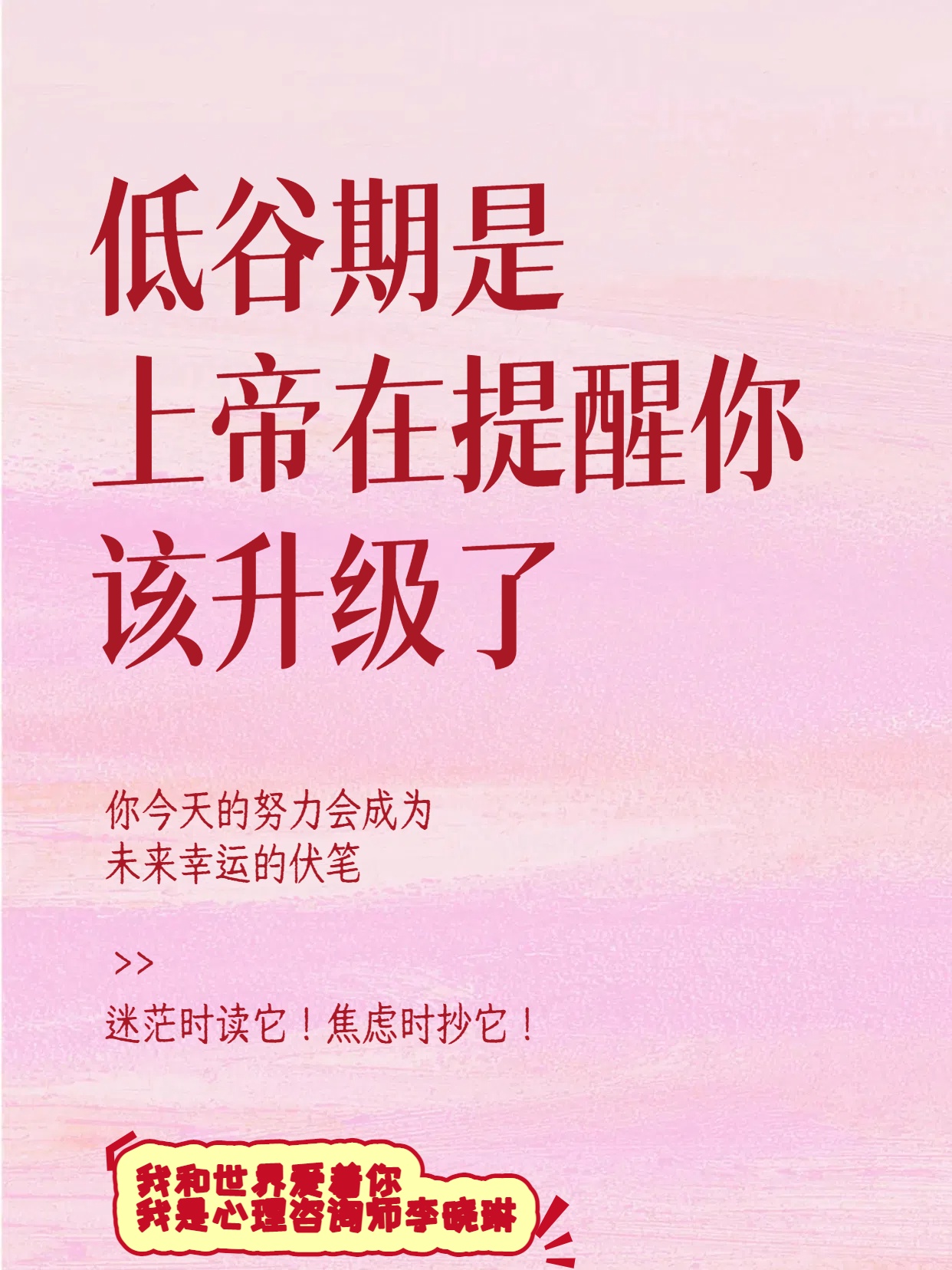 低谷期是上帝在提醒你,该升级了! 我是心理咨询师李晓琳,我和世界爱着你[玫瑰][爱心]