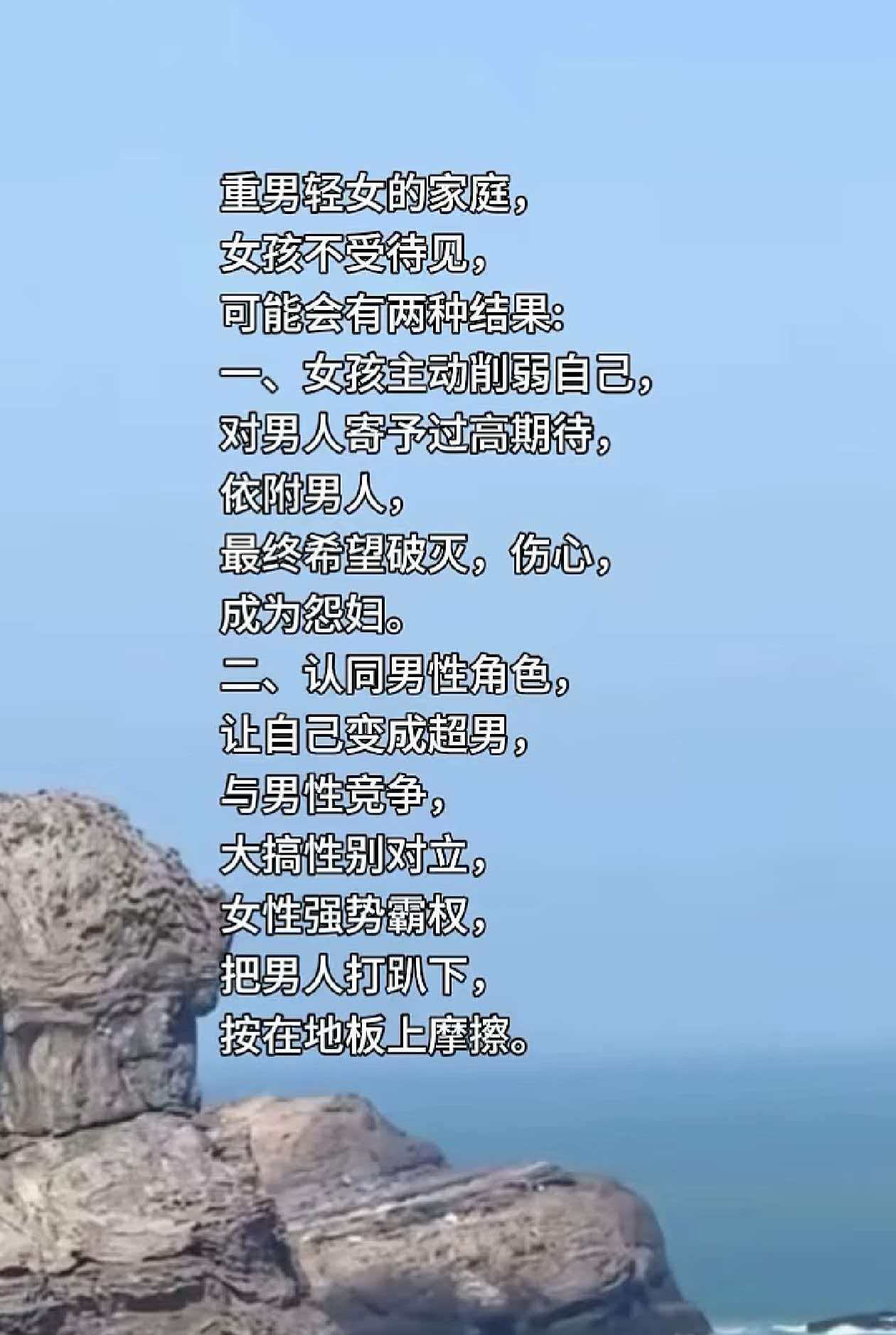 重男轻女的家庭,女孩不受待见,可能会有两种结果: 一,女孩主动削弱自己,对男人寄予过高期待,依附男人, 最终希望破灭,伤心,成为怨妇。 二,认同男性角色,让自己变成超男,与男性竞争,大搞性别对立,女性强势霸权,把男人打趴下,按在地板上摩擦。