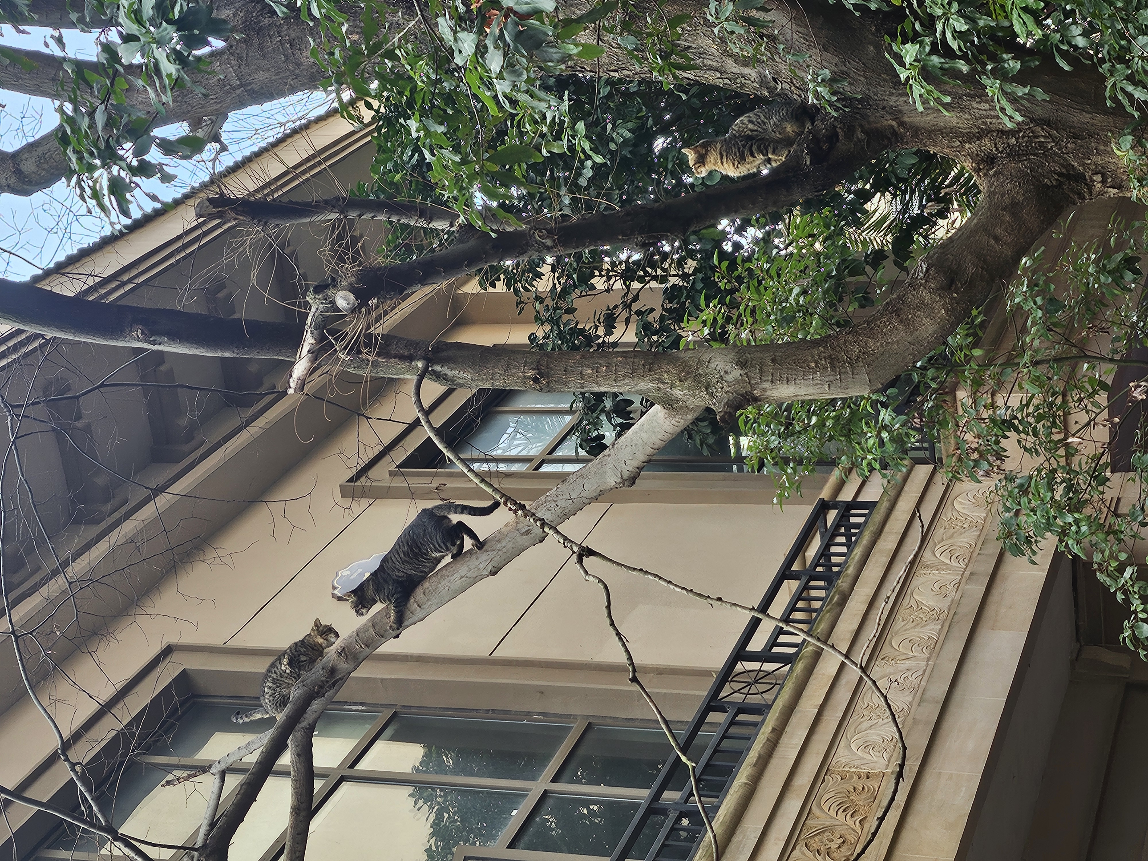 你看这三只小猫,各自站在树的不同位置,却都稳稳地托着自己的节奏: