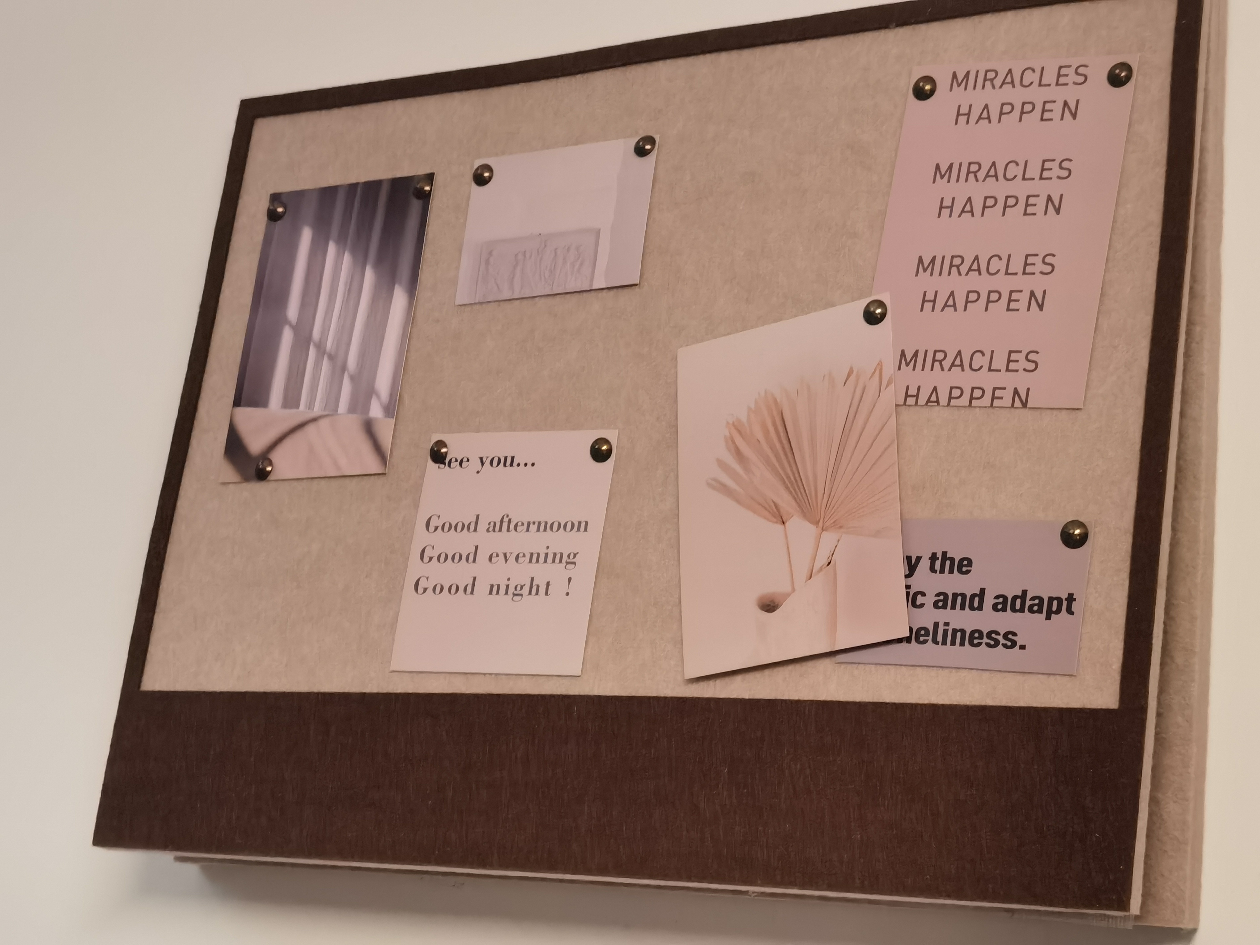 给爸妈家买电表箱装饰画,结果粗心的我忘记了要看装饰画的内框尺寸,买小了,因为我已经把图钉和画按在上面,装饰画有了孔会影响店家二次销售,不能退货了,爸爸埋怨我说:“不要你买,你非要买”。我也开始责备自己没事找事。一个人拿着美工刀想把毛毡的边框裁的窄一点,这样边框裁窄后多出来的尺寸就够了,半个多小时的时间,我一点一点的在用裁纸刀划着。这时候妈妈走过来帮我扶着边框,我告诉妈妈有了你的陪伴,我不再那么着急了,自我责备的心情也减少了很多。反而很享受和妈妈在一起的时光。本来这次失误给我带来了烦恼,却让我感受到妈妈带来的陪伴,原来爱是不需要语言的。被支持的感觉很滋养,我也想用这样的陪伴给到我的孩子,妈妈给我上了一课