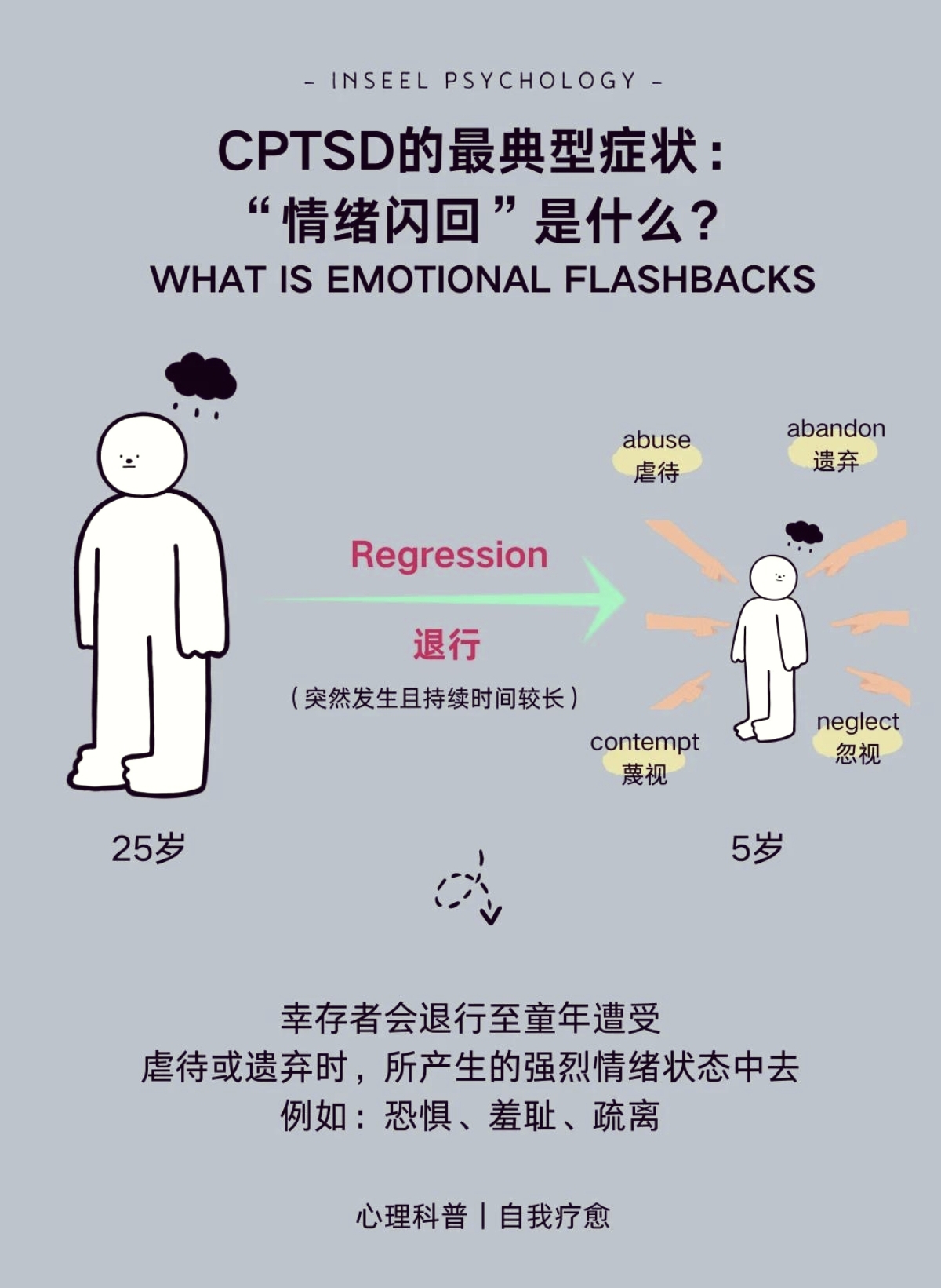 复杂性创伤(CPTSD)的症状: 1.绝望的孤独感和被遗弃感 2.脆弱的自尊 3.依恋障碍 4.发展停滞 5.人际关系困难。 6.极端的情绪波动 7.发生解离 8.极易触发战或逃反应 9.对应激情绪过度敏 10.自杀意念很强