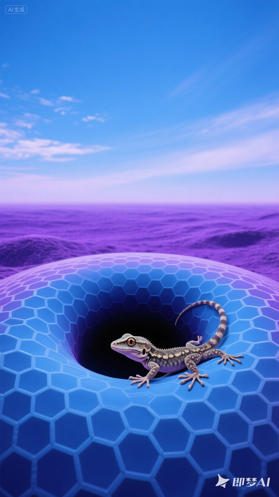 傍晚时分,有点累,躺在了妹妹(女儿)的房间的地板上,因为那里有地毯,一直想能躺在地上,那种平平的,凉凉的,身体和地板贴的很近感觉,那种好像能感受大地的气息似的,打开了音乐,闭上了眼睛一片漆黑,漫漫的上半身随着音乐的起伏,上下左右,此起彼伏,出现一个个光晕般由内向外的波动,然后慢慢消失,此时深蓝的夜空出现密密麻麻的繁星一个挨着一个,斜向下来发出一束束温暖的光,如拉丝般的密,它像是方形,但只我看到它最左边的一部分,在左边至远的地方稀疏散落着一颗颗闪烁的明星,我觉得他们离我很遥远,因为我看过去的方向太高了。一下子来到了又一个地方,远处紫色由远及近挨着蓝色的天空,和蓝色相接的地方是蜂窝状的表面材质的圆形体,圆形中心是一个黑洞,一只壁虎从黑暗的洞口爬出,左顾右盼的像是在找寻着什么似的。