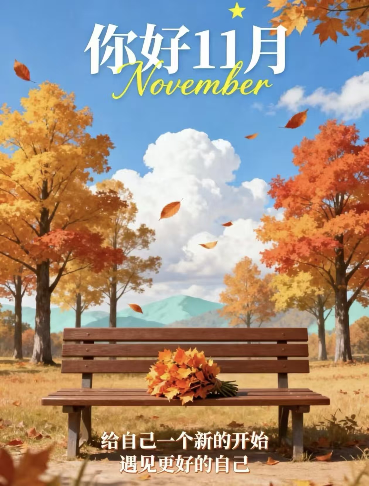 叶舞秋晨,开启全新11月,追你心中的梦,把岁月过得五彩斑斓,把日子过得充实欢畅。 新的一天,平安喜乐,万事胜意,所愿皆成! 早安~11月!