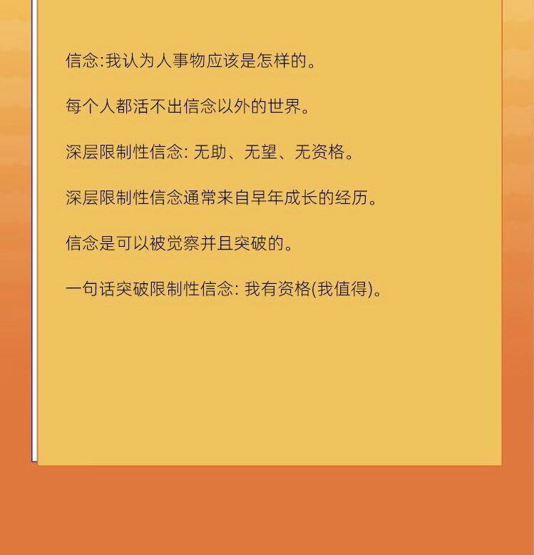 学到了限制性信念是如何悄悄限制自己的, 比如“我不行”“我做不到”这类想法, 其实是过去的经历和评价形成的思维枷锁, 并非客观事实。 我感受到了被这些信念束缚的沉重, 也体会到了突破认知后的轻松。 原来很多看似无法跨越的障碍, 只是自己给自己设的限, 只要敢于质疑和挑战,就能打开新的可能。 主动觉察自己的限制性想法, 当出现负面自我暗示时, 及时用积极的证据反驳。 遇见更好的自己!