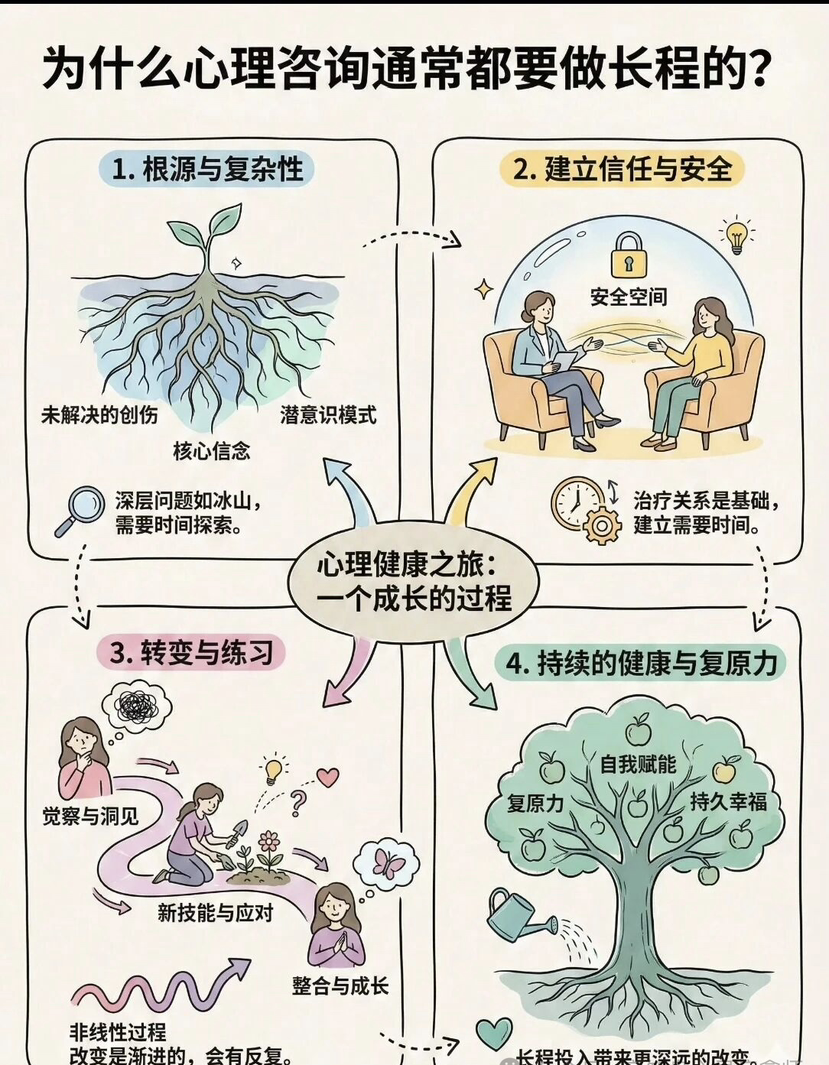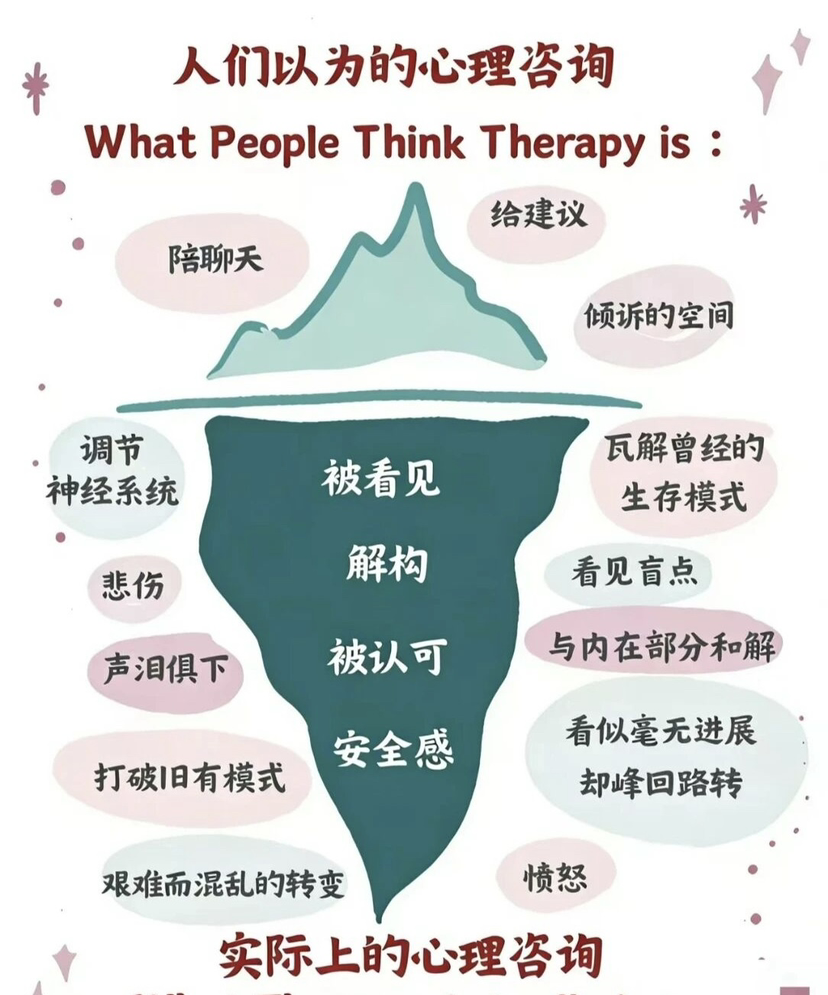 人们以为的心理咨询,是水面之上的轻松陪伴——陪聊天、给建议、找个倾诉的出口。 而实际上的心理咨询,是潜入水下的深度探索: 被看见、被认可、获得安全感,在解构与和解中打破旧有模式,在看似停滞的混乱里,完成艰难却关键的转变。 它不只是情绪的宣泄更是一场重建自我的旅程。